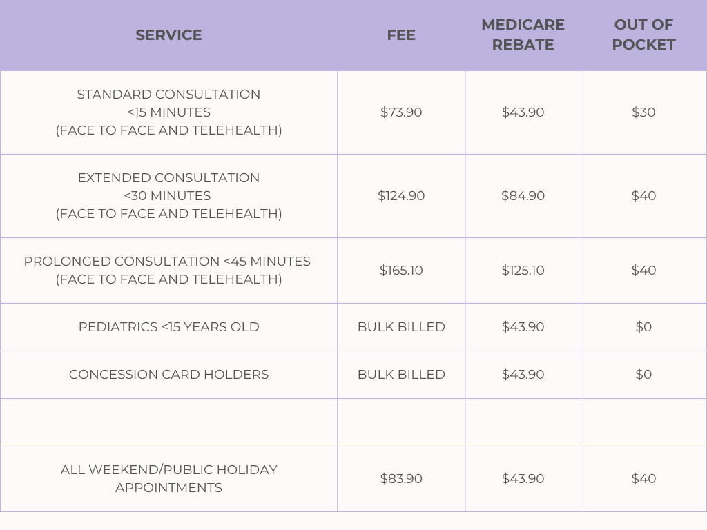 • On Weekends and Public Holidays, no Bulk Billing services available. All consultations will attract a Gap fee of $40.
